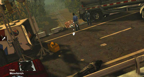 It turns out that there is a large number of zombies coming your way. You can burn them (an optional choice). To do so, drop (use) the Blowtorch from the bridge. Quickly run to the other side of the bridge.
