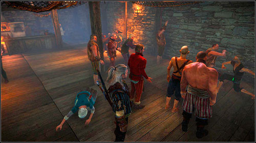 It's quite impossible to miss and not hear the fighting men in the lower part of the tavern (the large gathering of people also speaks for itself). Speak with anyone and Sheridan will automatically join in. He will offer you a fight with very easy rules - you have to defeat your enemy. Fist fighting is just a Quick Time Event (QTE) - you have to press the proper buttons when prompted. Your first enemy will be Stycho - he should be no match for you, even if you miss some hits.