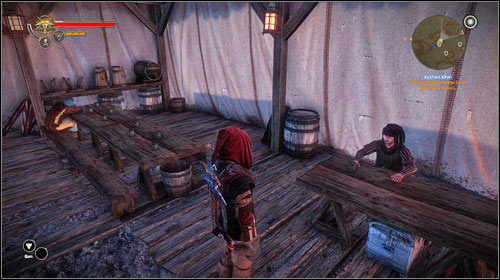 Once again head to the canteen (M25, 3), where you will find the relic vendor - without any chit-chat, ask him for the spearhead. Unfortunately the vendor no longer has it and the information regarding its whereabouts has its price: you can pay him (or say that it's too much and choose the amount yourself) or convince him with intimidation, persuasion or Axii hex. You will learn that the spearhead has been won by a certain soldier, who's presently at Vergen.