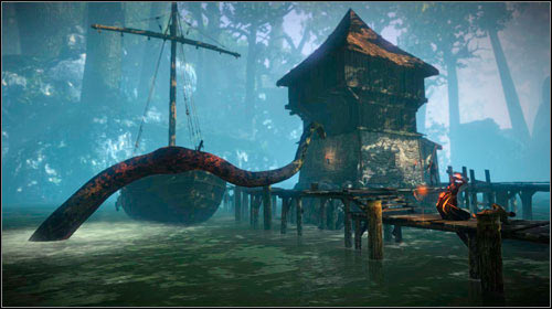 Once you end the conversation with your companions at the tavern, a man will rush in and tell about the monster's attack. Triss will note that someone's casting spells and it's worth to take a closer look at it. Go out through the back door leading to the harbour and a cutscene will start. You will note that a certain woman (if you completed Indecent Proposal, you will recognize Sheala) is chasing the monster away with magic. Don't waste any time and run there (M7, 9).