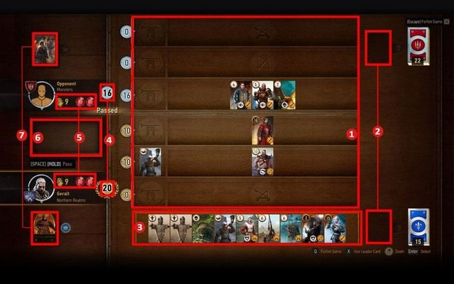 1. Board - you place your cards on your side (bottom) and enemy places his on the top. Each side is divided into three rows - melee units, ranged units and siege units. On the left you can see a slot for cards that improve the statistics of each row.