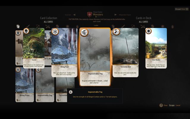 First group are weather cards. There are four: Biting Frost, Impenetrable Fog, Torrential Rain and Clear Weather. Each of them reduce the card strength in a specific row (for both sides) to 1. The Frost reduces infantry units, Fog reduces ranged ones and the Rain reduces the siege cards. Clear Weather card removes all weather modifiers. There might be more than one weather card active simultaneously.