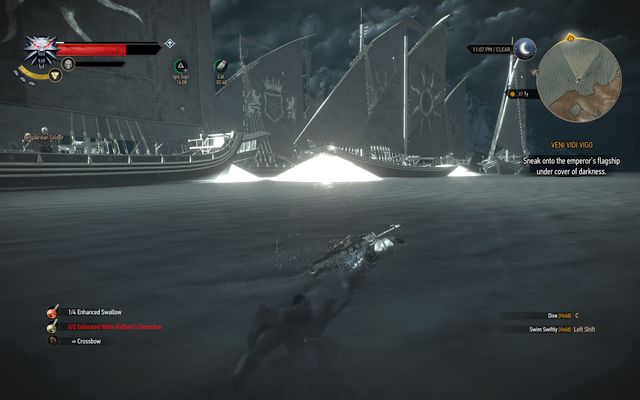 The second task you receive at the beginning is reaching Emhyr's ship. Do it during the cover of the night and avoid the light near the ships - if you are detected, soldiers will shoot at you with crossbows. Swim to the emperor's ship between other ones, it will be done easiest by diving. You will reach the deck by interacting with the anchor at the stern, from the north side.