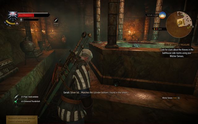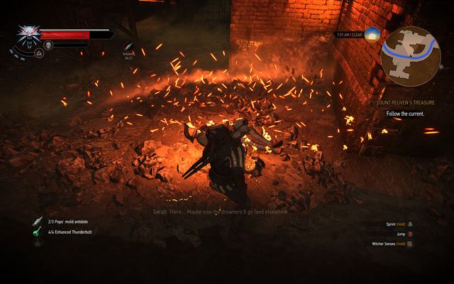 The potion works for seven minutes. Use the witcher senses through the whole way. You will find new clues and 3 jewelry pieces for your equipment. You will find two bodies on the way as well - burn them so that they won't lure any drowners (level 9). The most important thing is found at the end - a bomb part. Pick it up and go back to Sigi.