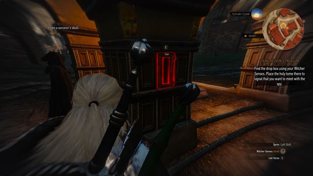 Go to the place where the box can be found. You will it at the back of one of shrine's pillars. Place the book you obtained before inside. Now go to the meeting. Enter the building and hide behind the door. Use meditation to wait till midnight. After you do it, instead of the spy you will find... Triss. Luckily, a moment later the person you are waiting for will enter.