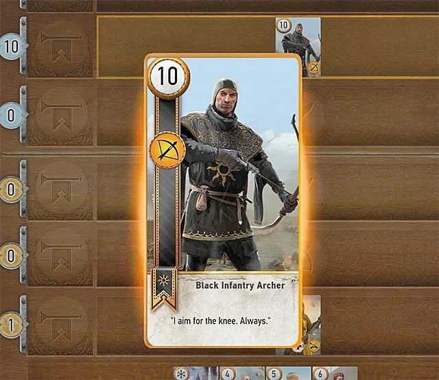 - One of the gwent cards (Black Infantry Archer) has a funny description referring to the guards from Skyrim game who whim that they are frequently hit in the knee.