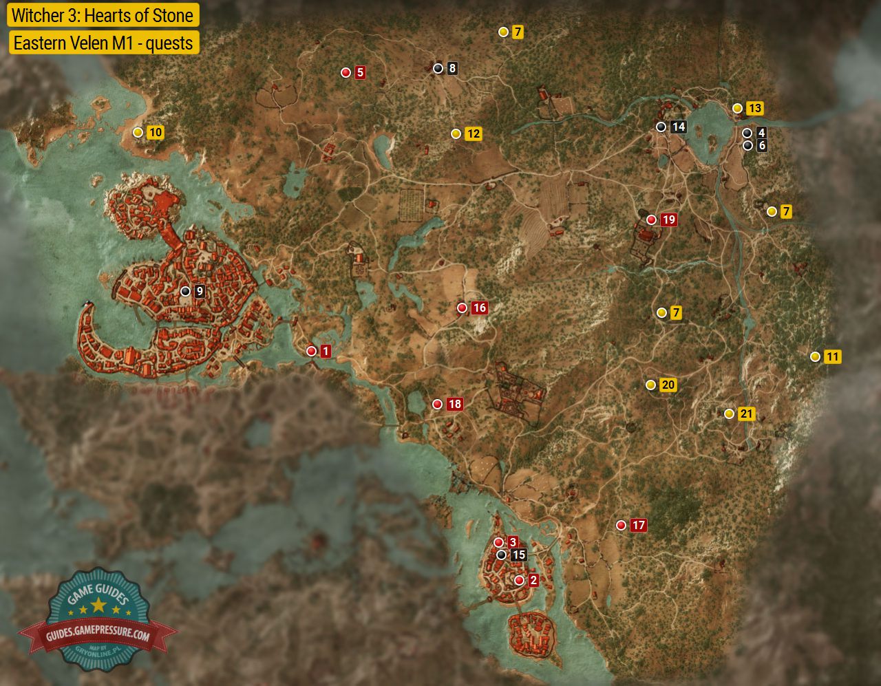 The map you see above shows the eastern part of Velen, especially its northern region. In The Witcher 3: Hearts of Stone expansion this territory is slightly bigger and greatly diversified with new main and side quests found on notice boards or obtained during conversations with key characters. In these regions you will also find new enemies (such as boars) with high experience level. The most important places that you will visit very often during the new storyline is Oxenfurt and Brunwich village in the northwestern part of the map.