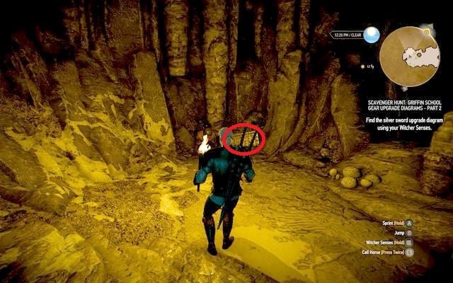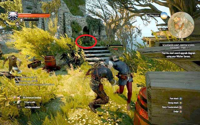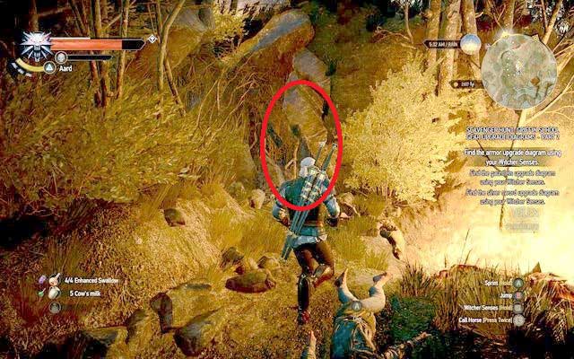 Use Aard to make your way through the rocks. Inside there should be a chest with a diagram for gauntlets. Watch out for wraiths and a noonwraith.
