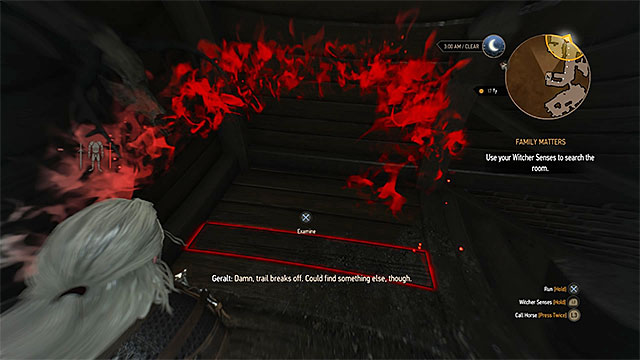 Return to the highest floor and enter the room in which the baron can be found. Activate witcher senses and start investigating interactive objects - the damaged wooden candlestick, vase with flowers, empty place on the wall and the painting on the neighboring wall. Examining the painting will lead to uncovering a hole. Check the wooden furniture on the other side of the wall. After listening to Geralt's comment, return to the candlestick and examine the tracks of spilled wine. As before, you must follow the red smells visible after activating witcher senses.