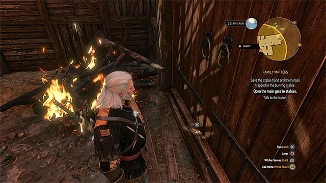 If you decided to help, go to the barn and get inside using a ladder. You must quickly get through the barn, effectively destroying successive obstacles with Aard sign or with the sword. The stable boy you seek is called Oswin and you can find him in the central part of the stables. Talking to him is not mandatory. Check the places in which the horses are held. Then, as quickly as possible, reach the main exit door from the stables. Look down and press the proper button/key in order to open the door and thus save Oswin and the horses.