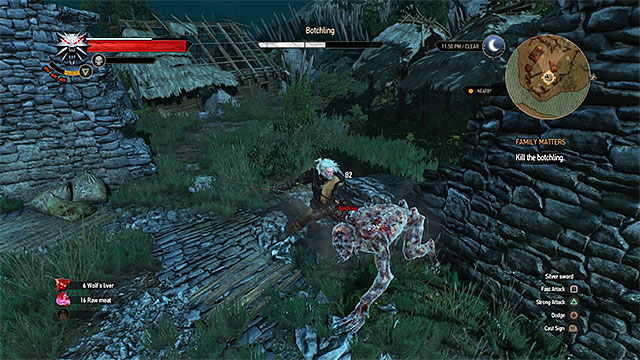 At first, battle with the botchling won't be complicated. You must avoid his strong attacks by jumping back or to the sides. Each of your attacks should start with an Axii sign that will stun the botchling for few seconds and make him harmless. Use these moments to deal few quick hits to the monster. But don't overdo it as the botchling, after regaining his strength, can perform a very strong counterattack. Later in the battle botchling will summon wraiths that will help him. Obviously, you can't completely ignore them, but nevertheless, try to focus on the main beast and attack the ghosts only when they pose a direct danger to Geralt. After a victorious battle, listen to the conversation with the baron and wait for Geralt to obtain Botchling Blood.