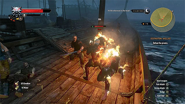 The sea trip to Skellige islands won't be boring. During the journey you will be attacked by pirates. They are the reason why it was recommended to develop Geralt - otherwise he could have been too weak to eliminate the enemies (they are on 15 and 16 experience level). If you haven't listened to the warning and you're on much lower experience level then try to avoid staying in one place on the deck, look for opportunities to kill pirates that are fighting your allies and help yourself with the crossbow, bombs and witcher signs.