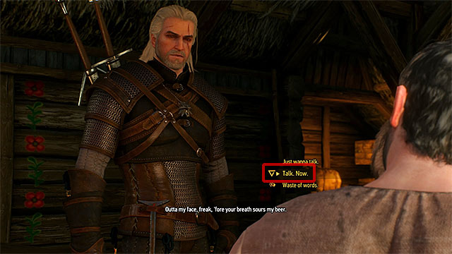 After the action moves to the inn, talk with Elsa (a warm welcoming awaits you if you refused to accept reward from Bram). You can trade with her but asking her about Yennefer is more important. The woman will suggest you should talk with other people in the inn. First, talk with two peasants. You can use Axii sign on one of them (dialogue option) and by gaining temporary control of his mind receive additional information (25 experience points). Albert Geert sits on the right from the bar. Listen to the talk - after that you can either play cards with him or not (it doesn't affect the quest). Last person you must talk to is Gaunter O'Dim. You can drink with him or refuse the alcohol.