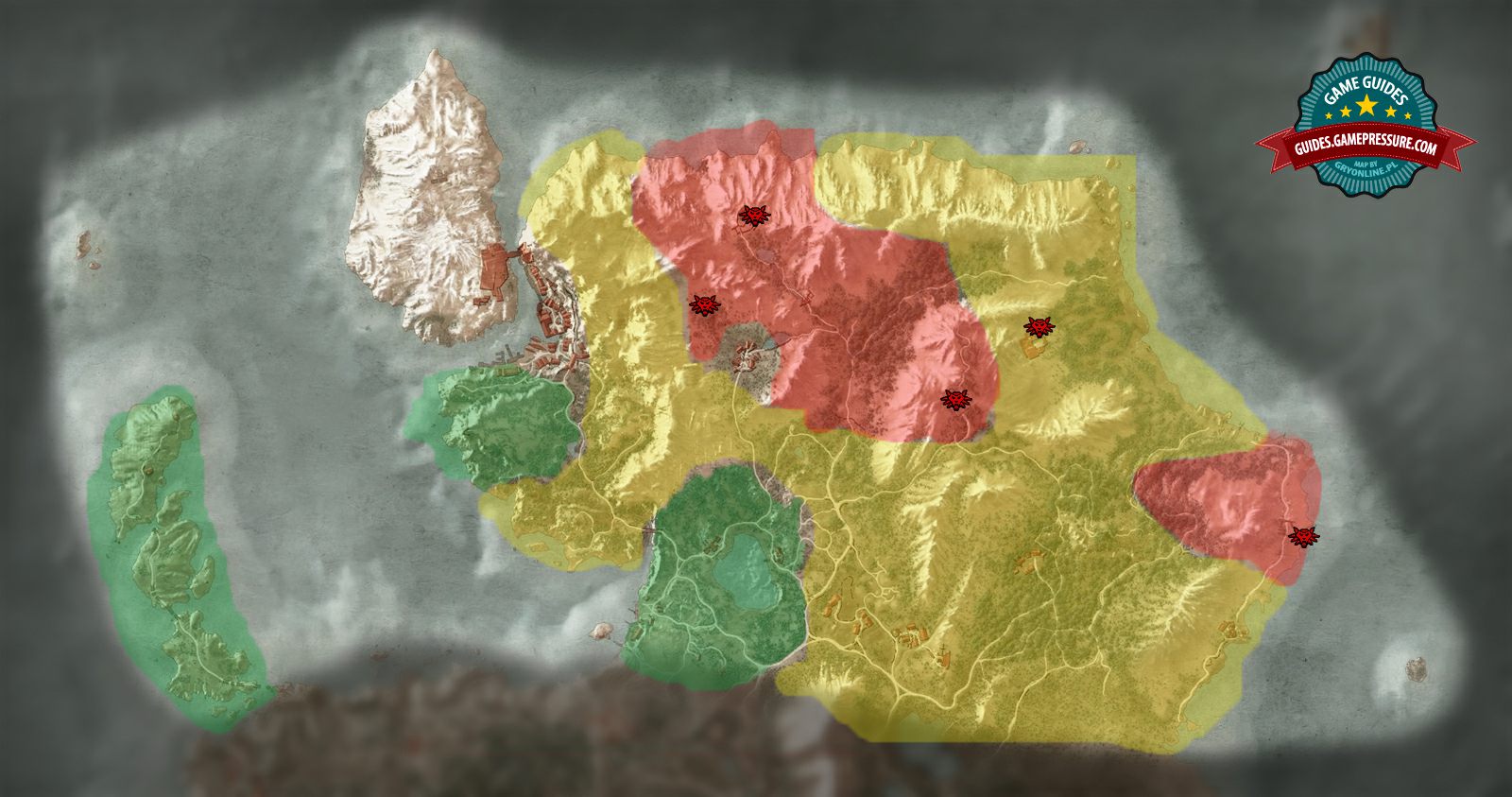 The map above shows Kaer Trolde, the northern part of the main island that is a part of the Skellige islands archipelago. Places where you will find enemies on specific levels have been marked on the map. Some of them are constantly on the move and because of that the territories shown should be considered as approximate. Recommended character level for exploring this location is 15-18.