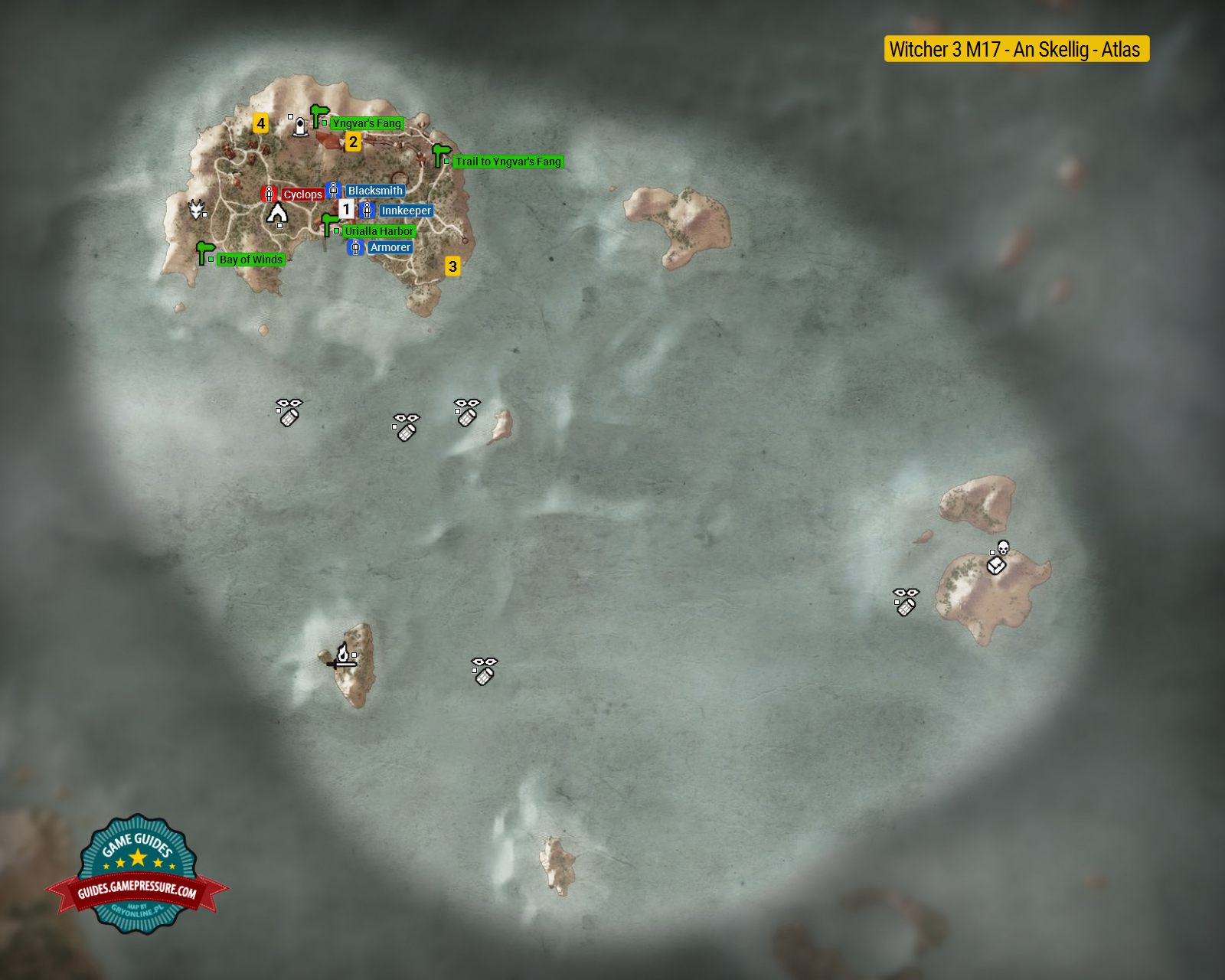 On this page of the Witcher 3 Wild Hunt guide, you will find a map of An Skellig island and smaller surrounding islands that are part of the Skellige archipelago. On the map of the world atlas we have marked, among others, important areas of An Skellig, as well as locations of treasures found underwater.