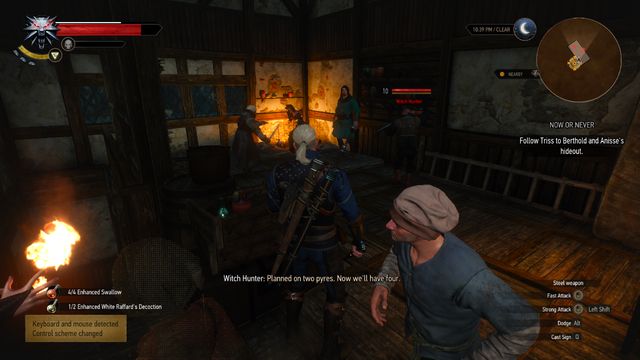 You must act quickly inside, otherwise the Hunters can kill the pair you are saving. You should have the Aard sign prepared and use it the very moment you enter the first floor. While walking down you can talk to building owners though it won't make any difference. Now follow Triss to the inn. If you decided to help those two, the inn owner will die and you will have to take care of three more Hunters in the inn.