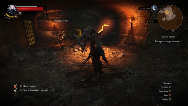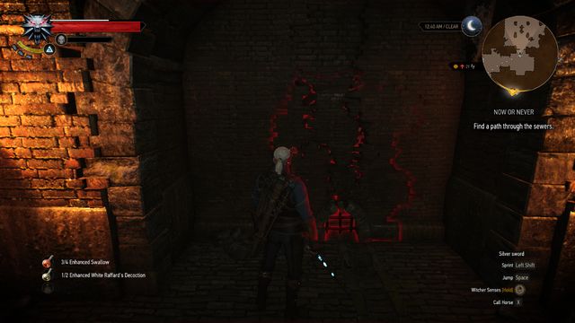 Your task is to clean the sewers. Make sure Triss is following you, without her you won't open the closed door. Place the Necrophage oil on your sword, Muckixer (level 14-15) will be your main opponents in the sewers. Walk down the stairs and go to the nearest turn left - on the right side you can destroy the wall and take the Disglair sword from the chest.