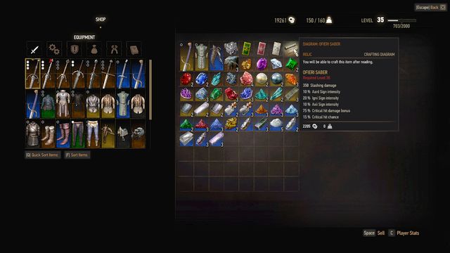 The Ofieri Sabre diagram, which allows creating new steel sword, can be bought from Ofieri Merchant during the first and all further encounters with him. However, the price is high - 2205 crowns. Below you will find the parameters of the Ofieri Sabre. The sword is required for unlocking the achievement/trophy I Wore Ofieri Before It Was Cool.
