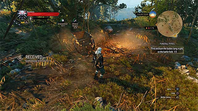 In order to start this quest you must find the Priest of the Eternal Fire east from Mulbrydale village (M2,5). During the conversation Geralt will be asked to burn the bodies in three different places. You must accept this task. You can reach the bodies in any order you want. There is a group of ghouls and exploding rotfiends near each of them. After securing a location, you must walk towards the body pyre, spill the oil and use Igni sign in order to set it on fire (9 experience points). At one of the piles Geralt will meet a survivor. Talk to him and you will learn about the true intentions of the Priest of the Eternal Fire (22 experience points).