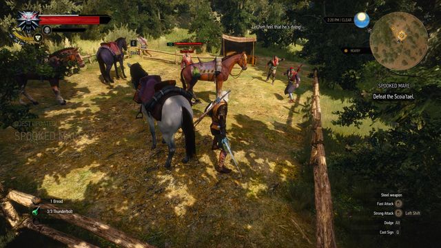 To track it down use witcher senses. Walk through a dirt-track for a while, then turn left towards the small lake. You will lose the track at the lake but you should easily find it back on the other side. Follow it until you reach a group of Scoia'tael on level 10. Defeat them. Your questgiver's horse is gray. For taking it back to the Peasant you will receive 20 crowns. It's important to lead the horse directly to the special place for him, only after that the quest will be accomplished. You can pick another horse as well, for leading him to the questgiver you will receive 50 crowns.