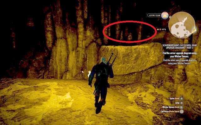 Take care of a rock to the right from the entrance, where some destructible stalagmites can be found. Break them with Aard to get to the chest with a diagram for the superior feline silver sword.