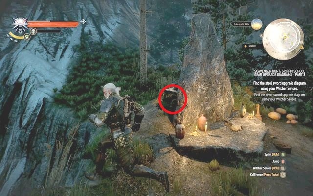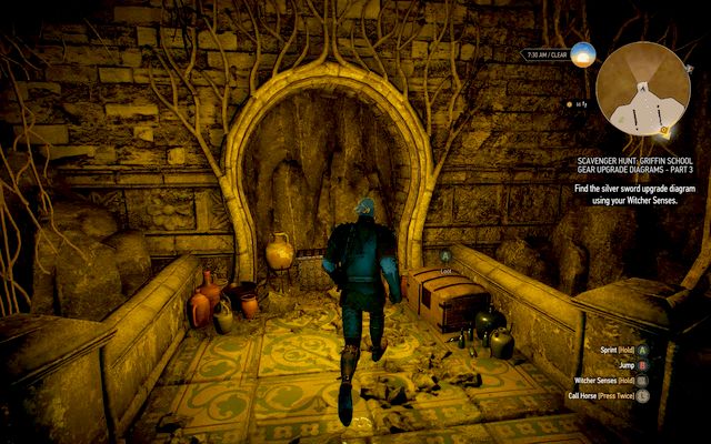 On the crossroads, go to the right. Walk through the cave to its end. When you get to the statue, approach two chests behind it. One of them has a silver sword schematic inside.