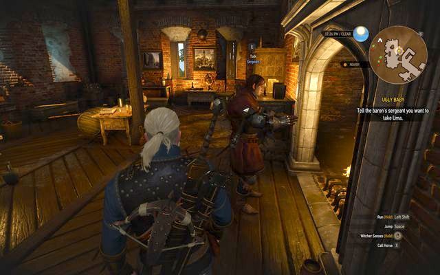 Depending on whether you have fully completed the Family Matters quest by finding Baron's Wife (Ladies of the Wood) in Velen, in the perch you will be talking to the Baron or the Sergeant who takes his place. Except for that slight difference, the quest will be the same in both cases. Talk with the stable boy after you receive permit to take Uma.