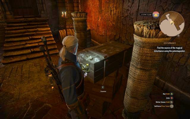 Go to the ground floor, near the entrance door. On their left side you will find the source of the disturbance - chests covered with white powder. After examining them, go back to the sorceress. Watch the cutscene and this phase will end.