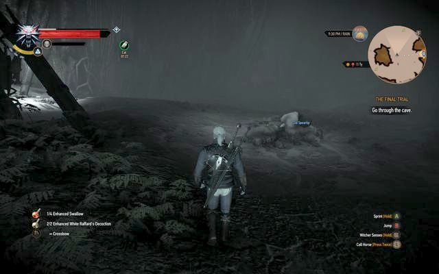 After killing the monster and obtaining the mixture, leave the cave. Eskel will ask if you want to race him - you won't lose anything in case of losing, winning will give you Hanged's Man Venom receipt and good shoes.