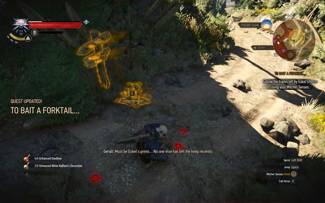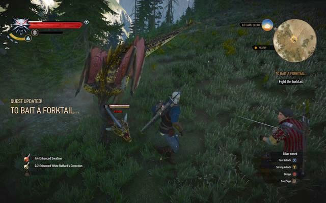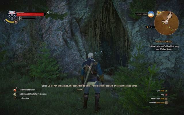 After a moment you will lose the trail. Examine the tree near the path and follow the smell up. After a moment, you will notice Eskel. Soon after that, a battle with the forktail (level 18) will start. Once you take half the hit points of the enemy, it will escape to its lair nearby. Follow the blood marks. The creature in the cave will have the same amount of health - it won't regenerate in the meantime.