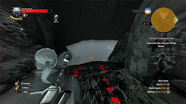Now you can go to the mine North-East from the inn. Activate your witcher senses and enter the cave. Follow the red markings. Because it is dark in the cave, it is wise to help yourself with the Cat potion. Examine the blood marks while exploring the cave and reach the place where Geralt must dive. Swim under water to be able to continue the walk.