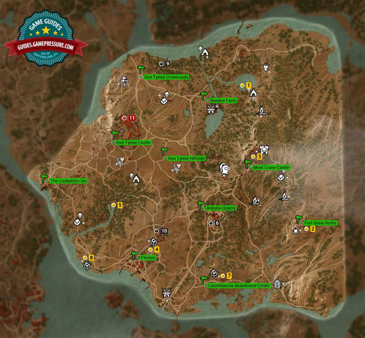 The above map shows the eastern part of Toussaint duchy. The most important locations of this part of the duchy are marked on the map. However, the map also contains information about places where you unlock quests and about the location of signposts which are helpful in using the quick travel. The most important location on the M3 map is the title Dun Tynne Castle with the areas surrounding it. In this part of the duchy you will also find, among other places, The Cockatrice Inn and Mont Crane Castle.