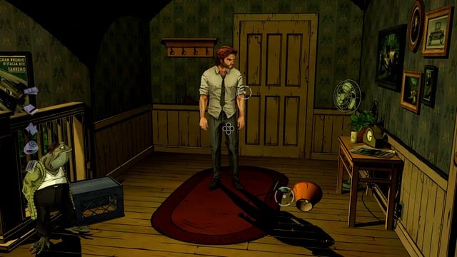 After the conversation with Mr. Toad, start searching through his apartment. Behind you, there is the door with a Busted Latch (You discovered something). Next to it, there is a broken Lamp laying on the floor. When you have investigated the hall, walk down the stairs on the left, which lead to the salon.