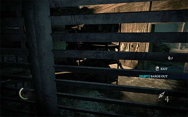 There is one more yard that you need to cross. You start at the upper balcony. I recommend against jumping down to the left, because you would land too close to the enemies. Taking the path to the right means the necessity to jump onto the rooftop, and its fragment would collapse under Garrett's weight. Quickly, hide in the wardrobe nearby, and wait for the opponents to finish checking the room. Only then, leave the cottage.