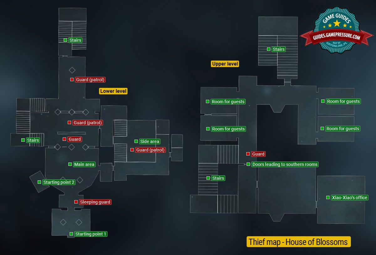 The above map presents the two main floors of the House of Blossoms. It is worth exploring the entire estate but, what is worth noting is the fact that especially the ground floor is well protected by several guards. On the map, there, of course, are references to the most important places and the estimated whereabouts of the opponents (an important note - some of them are patrolling the area).