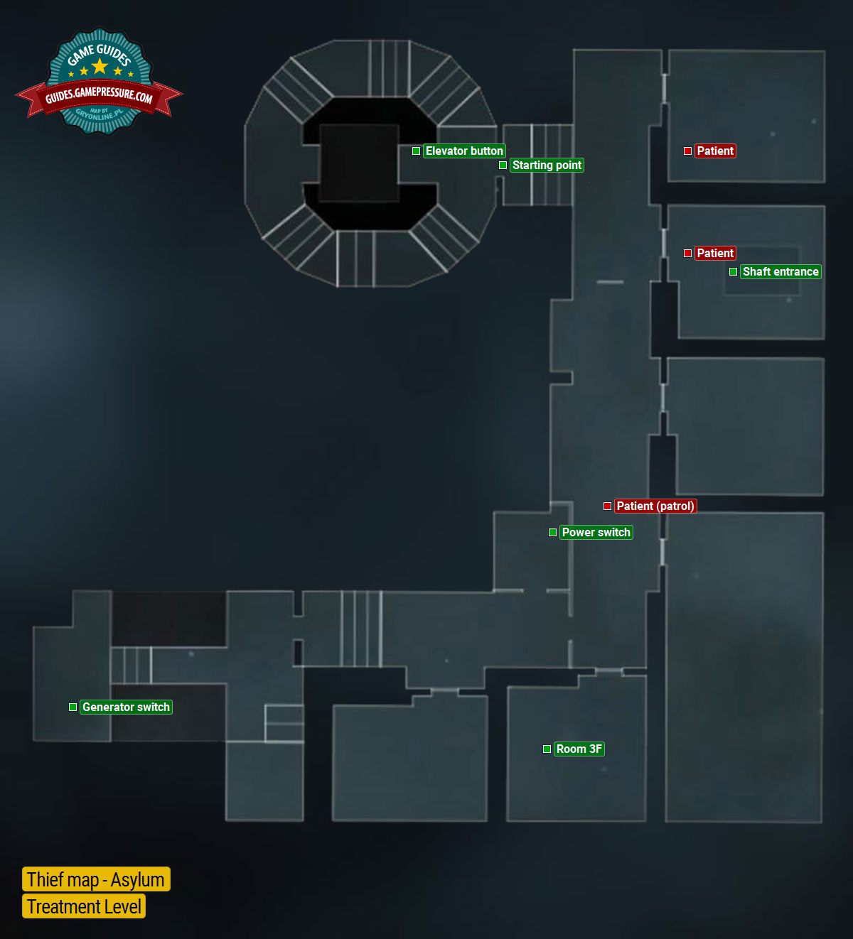 The above map presents the entire third floor of the Treatment Center (Garrett will, unfortunately, be unable to explore the rest of the floors). A noteworthy fact is that the hostile patients, which have been marked on the map, appear only after you have visited room 3F. A detailed description of how to reach that room, and of the remaining actions that you perform in that location, has been included further in this guide.
