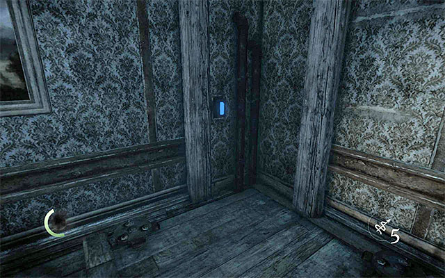 Locate the button on the wall and press it, which will reveal an interactive figure. You now need to solve the first, of two, puzzles, which consists in manipulating the elements of the figure. In order to solve the puzzle, you need to press the interactive elements on the figure, in the way that results in a situation, in which all of them click into slots. The solution to this puzzle has been presented in the above screenshot - keep pressing the individual elements in the order presented above, by starting on element 1 and finishing on element 5 (if you make a mistake, walk away from the figure, thanks to which the mechanism will reset).