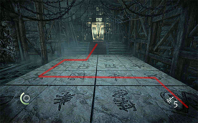 Select the newly unlocked passage, reach the next elevator and go to the lower level [Stonemarket - Project Pendulum]. Go South and, after you walk over the pressure plate, stop in the position shown in the above screenshot. You need to cross the chamber by stepping on the plates with drawings, identical to the ones on the notes that you have been finding. (Project Pendulum) and in the order corresponding to the days in the names of the individual documents (day 1, 6, 8, 11 i 13). The correct route has been presented above.