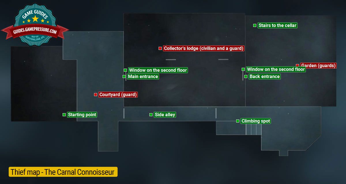 I recommend that you explore both of the floors in the building, where you need to remember that also the collector, who cannot spot you, will be staying there. Apart from that, in one of the rooms at the ground floor, there is a single guard and since he should not be moving away, you can distract him by closing/opening the door, turning off the lights or by using throwables. Note - the guard has a Coin Purse - 17G at his belt, which it is worthwhile to try stealing.
