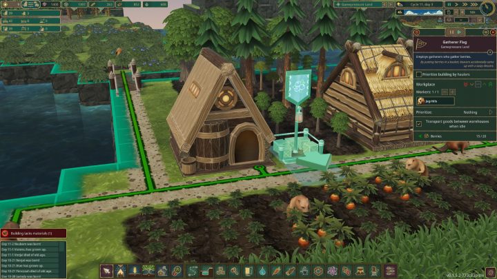 Lumberjacks will provide a fresh supply of the most essential resource - logs. Without them, you won't be able to build anything. Place the gatherer flag near the blueberry shrubs, and the Water Pump on the bank of a flowing river or similar body of water.