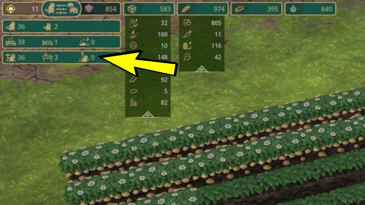 The population of your colony is displayed in the upper left corner of the screen. The numbers at the bottom represent, from left: