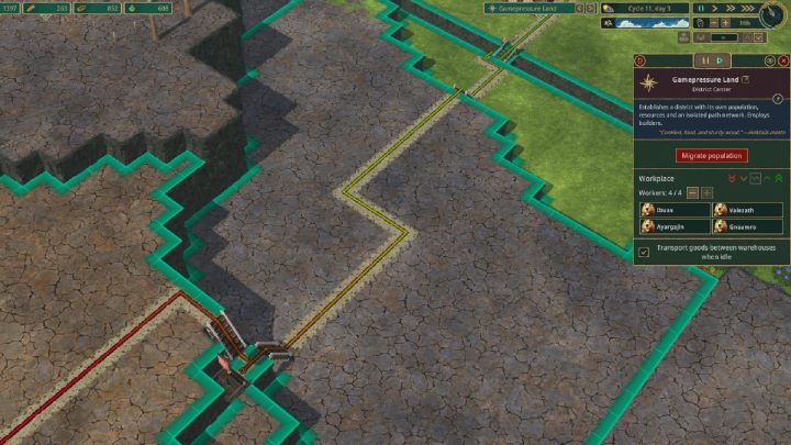 The distance of a building from the district's center can't exceed the red line marked on the road. No worker will reach such a building. The color of the line also indicates the speed at which the carriers will reach the building in question. If you need to get supplies to a faraway building fast, place a Hauling Post near it or assign a high priority to the structure.
