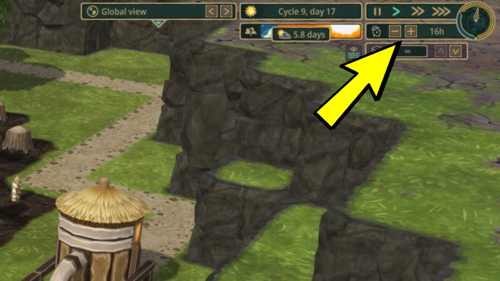 The beavers' basic working time is 16 hours. You can modify these hours as needed by using the plus and minus icons in the top right corner of the screen. If you find yourself in a situation where a drought is approaching and your colony has not yet prepared enough resources, force them to work harder. This will allow you to gather more water and food as well as produce resources in the workshops.