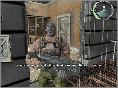 You will have to rejoin with a new allied soldier. Make sure that you've paid attention to what the was saying to you. Keep going straight. You will have to reach a much larger hole (screen). Your next objective is a small door. Open it and exit the building. Despite what you might think, you won't have to stay in the shadows here, because enemy soldiers are engaged with something else. They won't even see you standing near the fence.