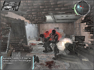 You will have to move on to the left corridor. There are some new enemy soldiers hiding in the next room. You should consider surprising them by activating a slow-motion feature (screen). You will probably be able to kill all of them before the suit runs out of power. Otherwise wait for the power bar to replenish itself.