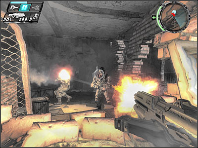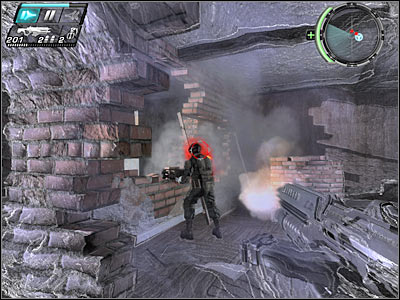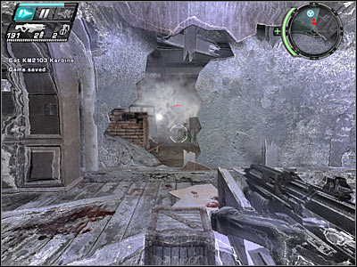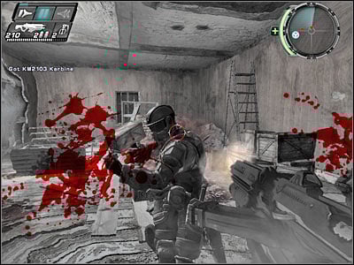 You should be able to collect a new weapon from one of the killed soldiers. It's going to be a shotgun called ShatterGun. I'd strongly recommend using it during some of the upcoming fights, especially since you'll be exploring small rooms. Sadly, you might have some problems acquiring enough ammunition. Head on to a destroyed wall (screen) which leads to a new room.