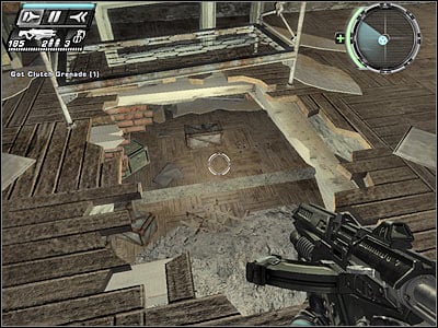 You should be very thorough in securing this area. Make sure that you've checked all of the surrounding groups. Once it's safe, locate a large hole in the floor (screen). I'd strongly recommend that you save your progress here. Use the hole to get down to the lower floor of the building.