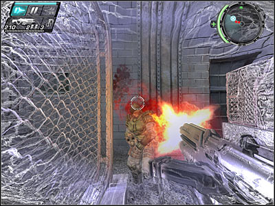 Keep moving towards your current target. You will have to defeat one more group along the way. It would be a good idea to use the grenades to kill them. You can also make this easier by going into slow-motion (screen). Either way, you will have to secure this passageway. Keep moving straight.