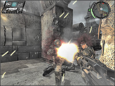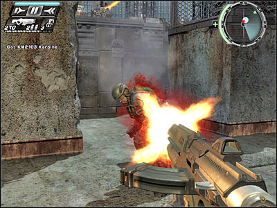 Enemy soldiers will appear to your right, so make sure that you're ready to defend yourself against their attacks. You could also try and surprise them (screen) with a little help from a time stop option. Make sure that you're using a shotgun, so you'll be able to kill them quickly. Head on to your final goal area.