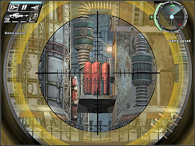 Make sure that the area is safe. You shouldn't have any problems finding the third sniping area. It can be found to your left. Use the zoom option and find the gas canisters (screen). Destroy one of these objects. A chain reaction not only will destroy the AA gun, but a part of the roof as well. Now you should consider moving back a little, because enemy soldiers are heading your way.